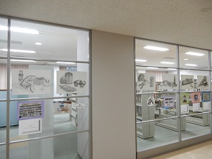 廊下側に静物デッサンを掲示しています。こちらは2年普通科図書委員が描いた作品です。