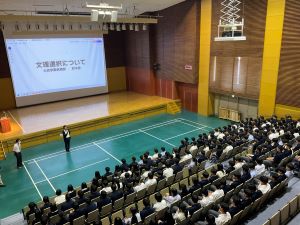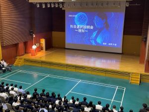 9月10日(水)・10月8日(水)の2日間で、 1学年普通科の生徒を対象に『文理コース説明会』を行いました。 1日目では、 株式会社リクルート様より文理選択についての重要なポイントを学びました。 2日目では、 文理選択する際に注意するポイントを 教務部や文系、理系の先生、英語コースの生徒から教えてもらいました。 この2日間を経て文理選択についてぼんやりとしていたイメージがはっきりしたものになったように思えます。 「自分に合った未来」を選べるように今後の進路をしっかり考えてほしいです。