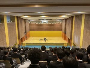 校長先生からは、先日ノーベル賞を受賞されたお二人の話や日本人初受賞の湯川博士の話を踏まえ、生徒の皆にも諦めずに自分の目標達成に向かって頑張り続けてほしいという話がありました。