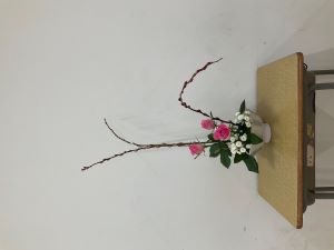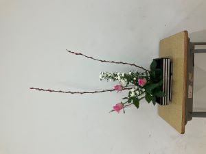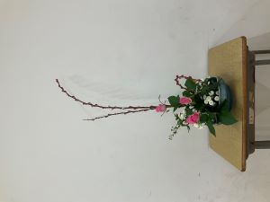 2学期に全6回の活動を行い、本日が2学期最後の回となりました。今回は、クリスマスを思わせる赤芽柳、白のスプレー菊、やわらかなピンクのバラを用い、季節感あふれる作品に仕上げました。