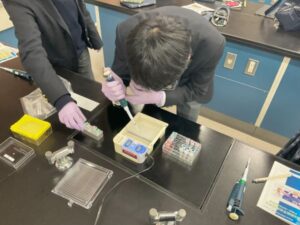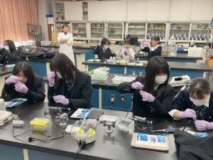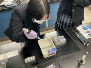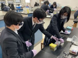 2年生の理系生物選択者を対象に、「ALDH2遺伝子の多型解析」の実験を行いました。実験器具・試薬等はすべてかずさDNA研究所様からお借りし、Zoomによる講義もしていただきました。 ALDH2とは、アルコールを代謝する際に生成されるアセトアルデヒドという有害物質を分解する酵素の一つです。この酵素の遺伝子のわずかな違い(遺伝子多型)が、「お酒に強い人・弱い人・まったく飲めない人」といった体質の違いを生むといわれています。 実験では、3学期に学習したPCRや電気泳動を用いました。初めて使うマイクロピペットでの細かな作業に苦戦する生徒もいましたが、電気泳動では想像以上にはっきりとしたバンドが検出されました。 自分の遺伝子に関わるテーマということもあり、生徒たちは実験結果に強い関心を示し、遺伝子研究を身近に感じる機会となりました。